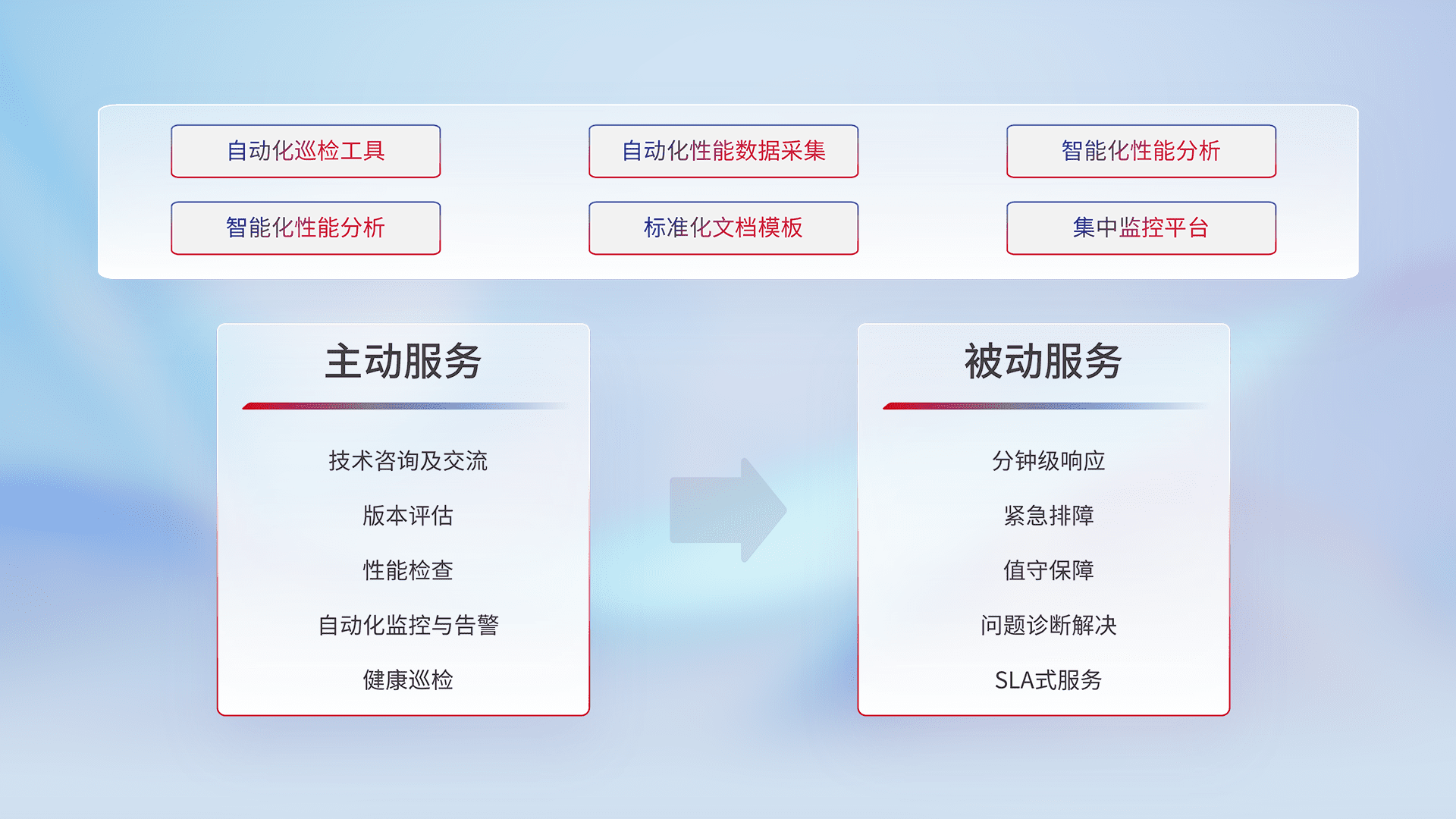 智能化工具和标准化文档,,,,保障服务质量,,,,提供主动服务(包含技术咨询、、、版本评估、、、性能检查、、、、自动化监控与告警、、、、健康巡检)和被动服务包含(分钟级响应、、、紧急排障、、、、值守保障、、问题诊断解决、、SLA服务)。。。